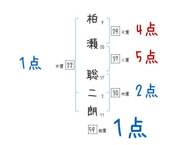 天運![]() | 柏瀬聡二朗さんの天運は29画の4つ星!完全主義で才能がある。厳格な心の持ち主。 家系が持つ宿命的な運勢を表します。祖先から受け継いだ苗字ですので自分の力が及びません。家柄を象徴します。 |
