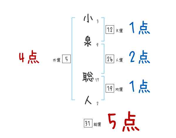 外運![]() | 小泉聡人さんの外運は5画の4つ星!健康で安泰。協調性に優れ、財産に恵まれる。 生活面を象徴する運勢です。外部から受ける影響力を表し、結婚運、家庭運や職場、環境への順応性を表します。 |