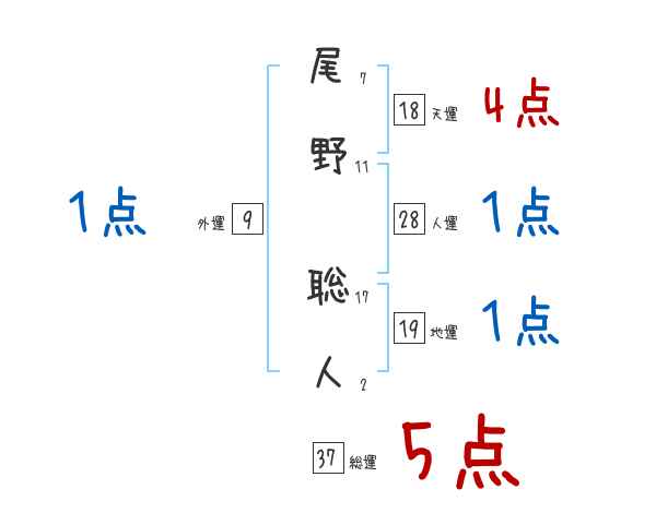 天運![]() | 尾野聡人さんの天運は18画の4つ星!情熱的で剛気。忍耐力があり信頼される。 家系が持つ宿命的な運勢を表します。祖先から受け継いだ苗字ですので自分の力が及びません。家柄を象徴します。 |