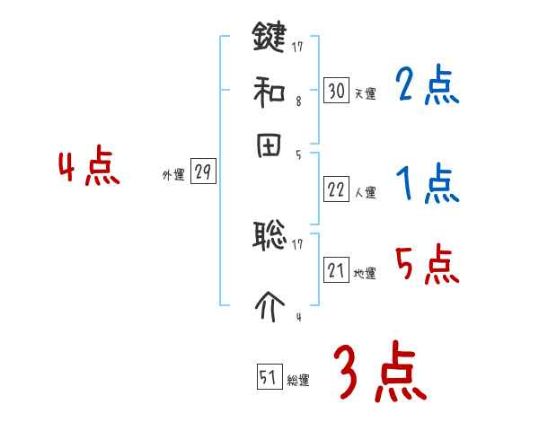 天運![]() | 鍵和田聡介さんの天運は30画の2つ星!浮き沈みの激しさに注意しましょう。 家系が持つ宿命的な運勢を表します。祖先から受け継いだ苗字ですので自分の力が及びません。家柄を象徴します。 |