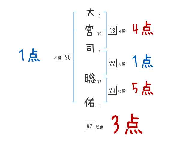 天運![]() | 大宮司聡佑さんの天運は18画の4つ星!情熱的で剛気。忍耐力があり信頼される。 家系が持つ宿命的な運勢を表します。祖先から受け継いだ苗字ですので自分の力が及びません。家柄を象徴します。 |