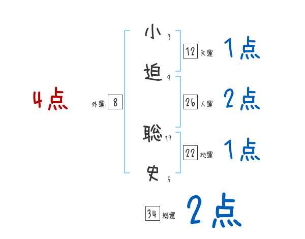 外運![]() | 小迫聡史さんの外運は8画の4つ星!勤勉家。根気強く努力し成功する。忍耐力がある。 生活面を象徴する運勢です。外部から受ける影響力を表し、結婚運、家庭運や職場、環境への順応性を表します。 |