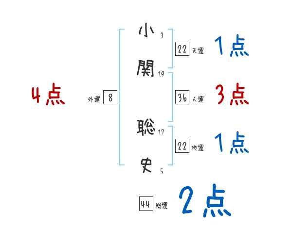 人運![]() | 小関聡史さんの人運は36画の3つ星!先見性が豊かです。多少神経質で苦労することも。 性格や才能などを表す2番目に重要な運勢です。人間関係や協調性、社会的な成功に影響します。主に20歳から50歳ぐらいまでの中年期の運勢を表します。 |