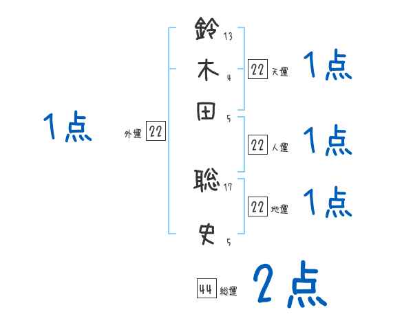 総運![]() | 鈴木田聡史さんの総運は44画の2つ星!誠実で慎重な性格。物事を考えすぎないように注意しましょう。 あなたの人生を表す1番重要な運勢です。生涯を通じて影響する総合運となり、主に50歳以降の晩年期に影響を及ぼします。 |