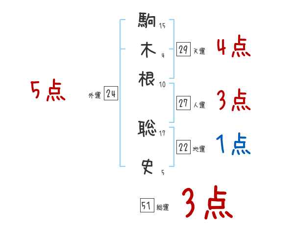 総運![]() | 駒木根聡史さんの総運は51画の3つ星!変化が激しく、危険に注意。堅実な性格。 あなたの人生を表す1番重要な運勢です。生涯を通じて影響する総合運となり、主に50歳以降の晩年期に影響を及ぼします。 |