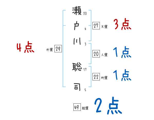 天運![]() | 瀬戸川聡司さんの天運は27画の3つ星!頭脳明晰だが強情で摩擦が多い傾向。孤立に注意。 家系が持つ宿命的な運勢を表します。祖先から受け継いだ苗字ですので自分の力が及びません。家柄を象徴します。 |