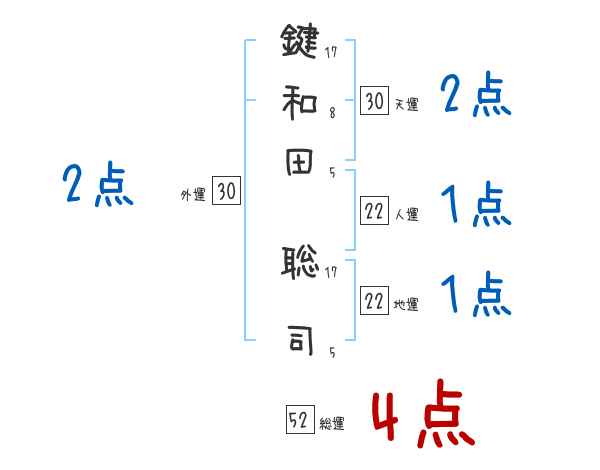 天運![]() | 鍵和田聡司さんの天運は30画の2つ星!浮き沈みの激しさに注意しましょう。 家系が持つ宿命的な運勢を表します。祖先から受け継いだ苗字ですので自分の力が及びません。家柄を象徴します。 |