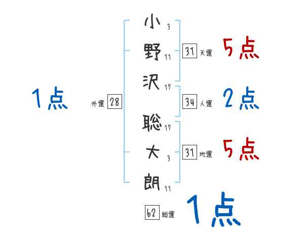 天運![]() | 小野沢聡大朗さんの天運は31画の5つ星!社交性があり判断力に優れる。順風満帆な人生で円満な生活。 家系が持つ宿命的な運勢を表します。祖先から受け継いだ苗字ですので自分の力が及びません。家柄を象徴します。 |