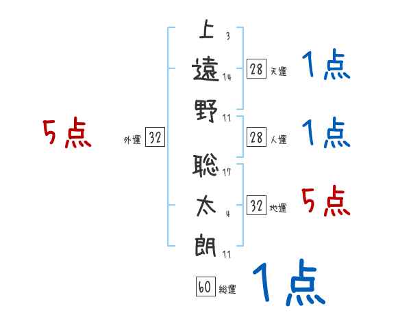外運![]() | 上遠野聡太朗さんの外運は32画の5つ星!柔軟性があり成功する。チャンスが多く金運が良い。 生活面を象徴する運勢です。外部から受ける影響力を表し、結婚運、家庭運や職場、環境への順応性を表します。 |