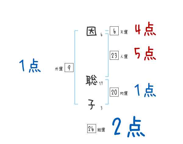 天運![]() | 因聡子さんの天運は6画の4つ星!慎重な努力家で信頼を得る。誠実な精神で向上心に優れる。 家系が持つ宿命的な運勢を表します。祖先から受け継いだ苗字ですので自分の力が及びません。家柄を象徴します。 |