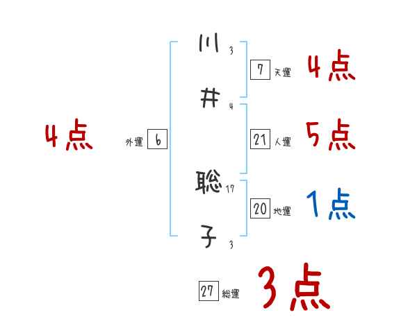 天運![]() | 川井聡子さんの天運は7画の4つ星!強い意志や信念を持ち独立心が強い。自立する。 家系が持つ宿命的な運勢を表します。祖先から受け継いだ苗字ですので自分の力が及びません。家柄を象徴します。 |