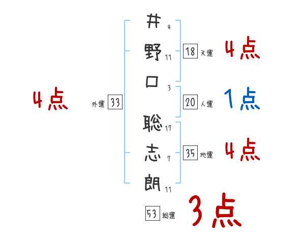 天運![]() | 井野口聡志朗さんの天運は18画の4つ星!情熱的で剛気。忍耐力があり信頼される。 家系が持つ宿命的な運勢を表します。祖先から受け継いだ苗字ですので自分の力が及びません。家柄を象徴します。 |