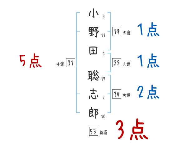 総運![]() | 小野田聡志郎さんの総運は53画の3つ星!やや見栄っ張りで虚栄心がある。散財に注意。 あなたの人生を表す1番重要な運勢です。生涯を通じて影響する総合運となり、主に50歳以降の晩年期に影響を及ぼします。 |