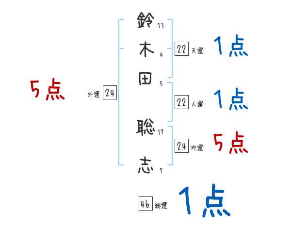 外運![]() | 鈴木田聡志さんの外運は24画の5つ星!家庭運が良く順調な人生。金運にも恵まれる。 生活面を象徴する運勢です。外部から受ける影響力を表し、結婚運、家庭運や職場、環境への順応性を表します。 |