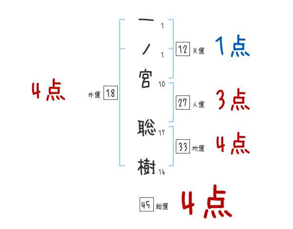 外運![]() | 一ノ宮聡樹さんの外運は18画の4つ星!情熱的で剛気。忍耐力があり信頼される。 生活面を象徴する運勢です。外部から受ける影響力を表し、結婚運、家庭運や職場、環境への順応性を表します。 |