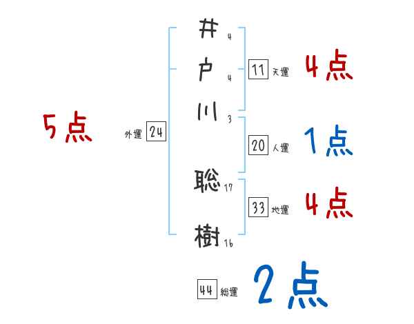 天運![]() | 井戸川聡樹さんの天運は11画の4つ星!着実に富や地位を得る幸運な人生。 家系が持つ宿命的な運勢を表します。祖先から受け継いだ苗字ですので自分の力が及びません。家柄を象徴します。 |