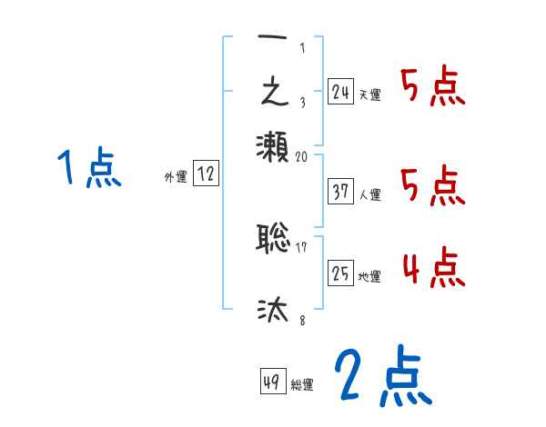 天運![]() | 一之瀬聡汰さんの天運は24画の5つ星!家庭運が良く順調な人生。金運にも恵まれる。 家系が持つ宿命的な運勢を表します。祖先から受け継いだ苗字ですので自分の力が及びません。家柄を象徴します。 |