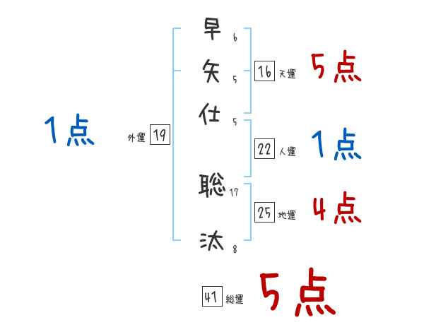 天運![]() | 早矢仕聡汰さんの天運は16画の5つ星!人望が厚く大きく発展する。逆転成功が見える。 家系が持つ宿命的な運勢を表します。祖先から受け継いだ苗字ですので自分の力が及びません。家柄を象徴します。 |