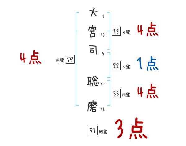 天運![]() | 大宮司聡磨さんの天運は18画の4つ星!情熱的で剛気。忍耐力があり信頼される。 家系が持つ宿命的な運勢を表します。祖先から受け継いだ苗字ですので自分の力が及びません。家柄を象徴します。 |