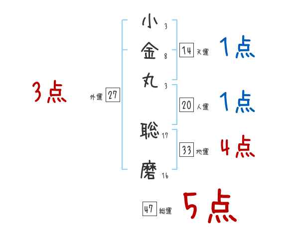 総運![]() | 小金丸聡磨さんの総運は47画の5つ星!実力が開花し発展する円満な人生。財に恵まれる。 あなたの人生を表す1番重要な運勢です。生涯を通じて影響する総合運となり、主に50歳以降の晩年期に影響を及ぼします。 |