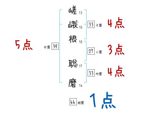 天運![]() | 嵯峨根聡磨さんの天運は33画の4つ星!権力志向でプライドが高い。勇気があり運を切り開き成功する。 家系が持つ宿命的な運勢を表します。祖先から受け継いだ苗字ですので自分の力が及びません。家柄を象徴します。 |