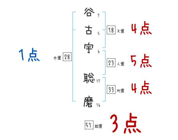 天運![]() | 谷古宇聡磨さんの天運は18画の4つ星!情熱的で剛気。忍耐力があり信頼される。 家系が持つ宿命的な運勢を表します。祖先から受け継いだ苗字ですので自分の力が及びません。家柄を象徴します。 |