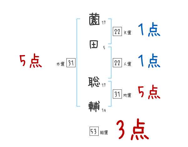 総運![]() | 薗田聡輔さんの総運は53画の3つ星!やや見栄っ張りで虚栄心がある。散財に注意。 あなたの人生を表す1番重要な運勢です。生涯を通じて影響する総合運となり、主に50歳以降の晩年期に影響を及ぼします。 |
