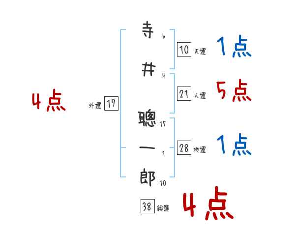 外運![]() | 寺井聰一郎さんの外運は17画の4つ星!積極的な行動力。地位を気づき財産を手に入れる。純粋な心と直感力。 生活面を象徴する運勢です。外部から受ける影響力を表し、結婚運、家庭運や職場、環境への順応性を表します。 |