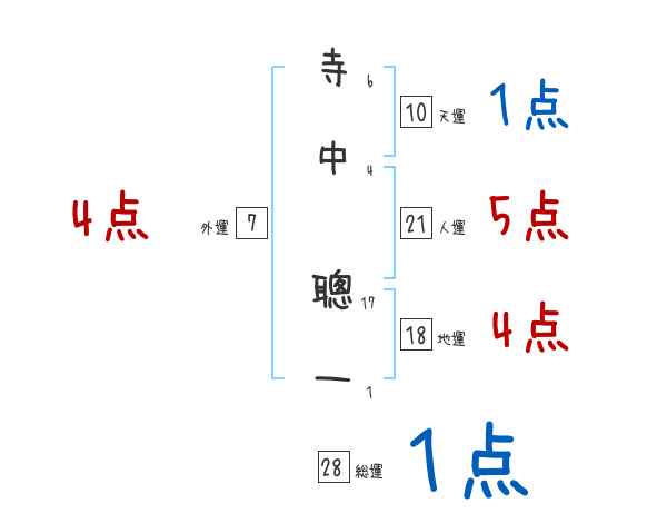 天運![]() | 寺中聰一さんの天運は10画の1つ星!不安を感じやすい傾向。ストレスを抱えないように注意しましょう。 家系が持つ宿命的な運勢を表します。祖先から受け継いだ苗字ですので自分の力が及びません。家柄を象徴します。 |