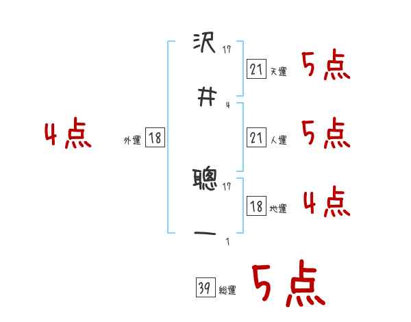 総運![]() | 沢井聰一さんの総運は39画の5つ星!社交性に優れ人望が厚い。人の上に立ち成功する。 あなたの人生を表す1番重要な運勢です。生涯を通じて影響する総合運となり、主に50歳以降の晩年期に影響を及ぼします。 |