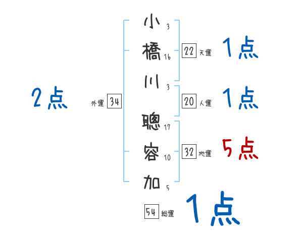 地運![]() | 小橋川聰容加さんの地運は32画の5つ星!柔軟性があり成功する。チャンスが多く金運が良い。 個性を表す基礎的な運勢です。性格形成や対人関係、行動力など家庭環境に影響されます。主に誕生してから20歳くらいまでの若年期の運勢を表します。 |