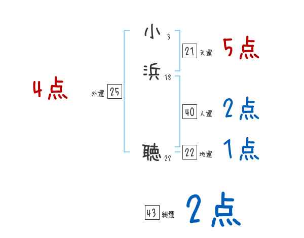 天運![]() | 小浜聴さんの天運は21画の5つ星!統率力がある。独立し成功する。名誉を手に入れる。 家系が持つ宿命的な運勢を表します。祖先から受け継いだ苗字ですので自分の力が及びません。家柄を象徴します。 |