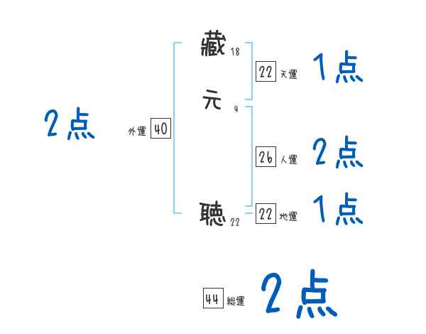 天運![]() | 藏元聴さんの天運は22画の1つ星!努力することが苦手ないっぽう手先が器用。芸術性にも優れる。 家系が持つ宿命的な運勢を表します。祖先から受け継いだ苗字ですので自分の力が及びません。家柄を象徴します。 |
