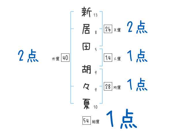 外運![]() | 新居田胡々夏さんの外運は40画の2つ星!自信過剰で物事に固執するためトラブルに注意。 生活面を象徴する運勢です。外部から受ける影響力を表し、結婚運、家庭運や職場、環境への順応性を表します。 |
