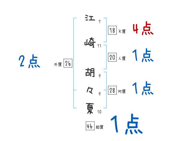 天運![]() | 江崎胡々夏さんの天運は18画の4つ星!情熱的で剛気。忍耐力があり信頼される。 家系が持つ宿命的な運勢を表します。祖先から受け継いだ苗字ですので自分の力が及びません。家柄を象徴します。 |