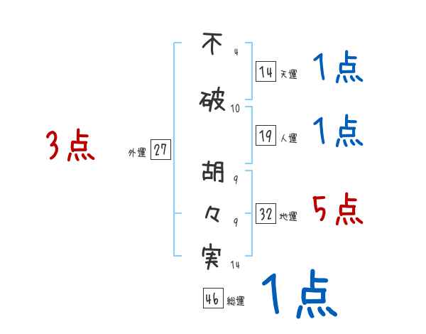 外運![]() | 不破胡々実さんの外運は27画の3つ星!頭脳明晰だが強情で摩擦が多い傾向。孤立に注意。 生活面を象徴する運勢です。外部から受ける影響力を表し、結婚運、家庭運や職場、環境への順応性を表します。 |
