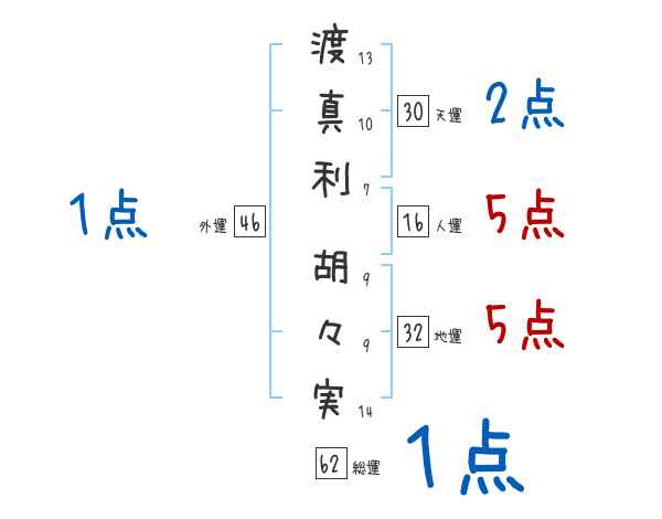 地運![]() | 渡真利胡々実さんの地運は32画の5つ星!柔軟性があり成功する。チャンスが多く金運が良い。 個性を表す基礎的な運勢です。性格形成や対人関係、行動力など家庭環境に影響されます。主に誕生してから20歳くらいまでの若年期の運勢を表します。 |