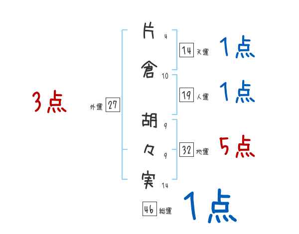 外運![]() | 片倉胡々実さんの外運は27画の3つ星!頭脳明晰だが強情で摩擦が多い傾向。孤立に注意。 生活面を象徴する運勢です。外部から受ける影響力を表し、結婚運、家庭運や職場、環境への順応性を表します。 |
