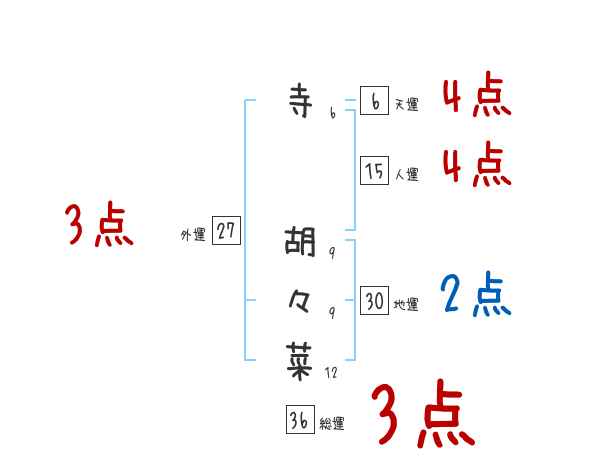 総運![]() | 寺胡々菜さんの総運は36画の3つ星!先見性が豊かです。多少神経質で苦労することも。 あなたの人生を表す1番重要な運勢です。生涯を通じて影響する総合運となり、主に50歳以降の晩年期に影響を及ぼします。 |