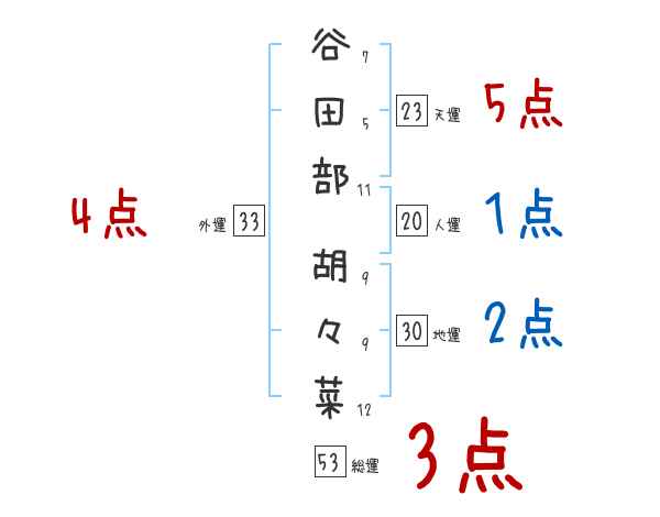 外運![]() | 谷田部胡々菜さんの外運は33画の4つ星!権力志向でプライドが高い。勇気があり運を切り開き成功する。 生活面を象徴する運勢です。外部から受ける影響力を表し、結婚運、家庭運や職場、環境への順応性を表します。 |