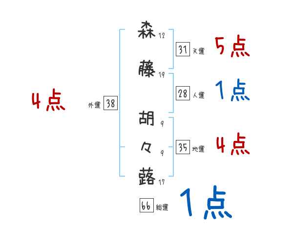 外運![]() | 森藤胡々蕗さんの外運は38画の4つ星!温厚な性格で技術的な才能を発揮する。職人的な仕事に向いている。 生活面を象徴する運勢です。外部から受ける影響力を表し、結婚運、家庭運や職場、環境への順応性を表します。 |