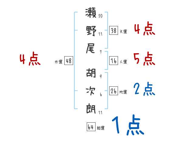 地運![]() | 瀬野尾胡次朗さんの地運は26画の2つ星!波瀾万丈かも。信頼できる人を大事にしましょう。 個性を表す基礎的な運勢です。性格形成や対人関係、行動力など家庭環境に影響されます。主に誕生してから20歳くらいまでの若年期の運勢を表します。 |