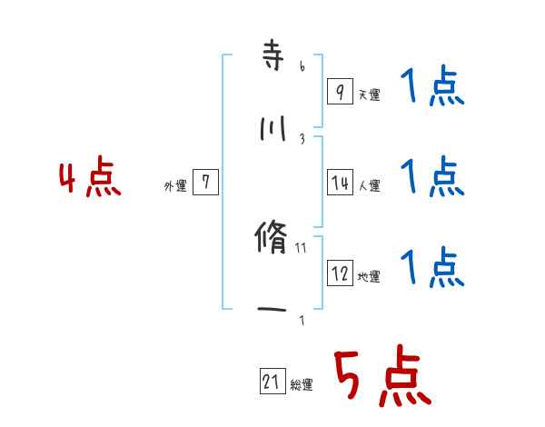 外運![]() | 寺川脩一さんの外運は7画の4つ星!強い意志や信念を持ち独立心が強い。自立する。 生活面を象徴する運勢です。外部から受ける影響力を表し、結婚運、家庭運や職場、環境への順応性を表します。 |
