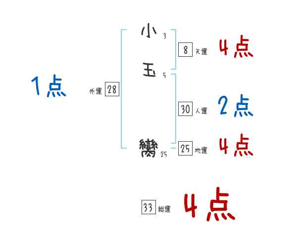 天運![]() | 小玉臠さんの天運は8画の4つ星!勤勉家。根気強く努力し成功する。忍耐力がある。 家系が持つ宿命的な運勢を表します。祖先から受け継いだ苗字ですので自分の力が及びません。家柄を象徴します。 |