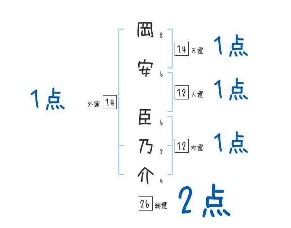 | 外運  | 岡安臣乃介さんの外運は14画の1つ星!人に対して優しいがストレスを溜め込みがち。人間関係のトラブルを避けるよう気をつけましょう。生活面を象徴する運勢です。外部から受ける影響力を表し、結婚運、家庭運や職場、環境への順応性を表します。 |