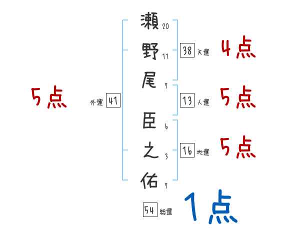 総運![]() | 瀬野尾臣之佑さんの総運は54画の1つ星!トラブルが多いかも。周りをよく見て協調して過ごしましょう。 あなたの人生を表す1番重要な運勢です。生涯を通じて影響する総合運となり、主に50歳以降の晩年期に影響を及ぼします。 |