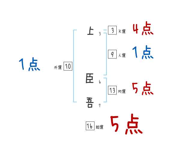 天運![]() | 上臣吾さんの天運は3画の4つ星!活動的で才能に恵まれ、多くの信頼を得る。希望に満ち成長する。 家系が持つ宿命的な運勢を表します。祖先から受け継いだ苗字ですので自分の力が及びません。家柄を象徴します。 |