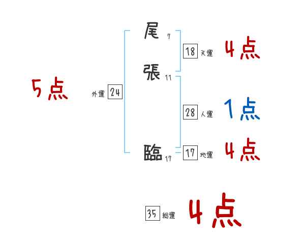 天運![]() | 尾張臨さんの天運は18画の4つ星!情熱的で剛気。忍耐力があり信頼される。 家系が持つ宿命的な運勢を表します。祖先から受け継いだ苗字ですので自分の力が及びません。家柄を象徴します。 |