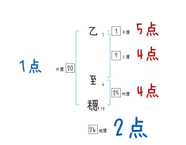 天運![]() | 乙至穏さんの天運は1画の5つ星!行動力、指導力があり出世し繁栄する。幸運に恵まれる。 家系が持つ宿命的な運勢を表します。祖先から受け継いだ苗字ですので自分の力が及びません。家柄を象徴します。 |