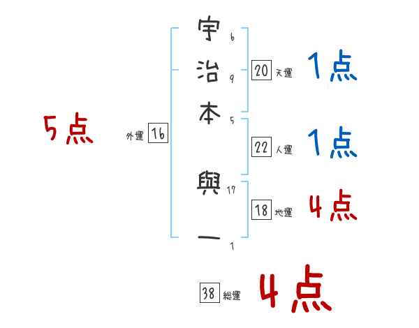 外運![]() | 宇治本與一さんの外運は16画の5つ星!人望が厚く大きく発展する。逆転成功が見える。 生活面を象徴する運勢です。外部から受ける影響力を表し、結婚運、家庭運や職場、環境への順応性を表します。 |